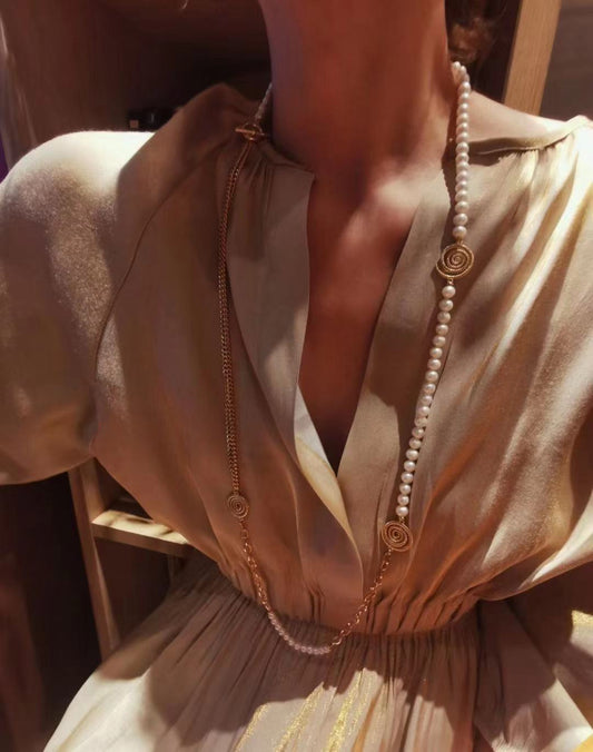 Golden Chain and Pearl Statement Necklace with Spiral Design