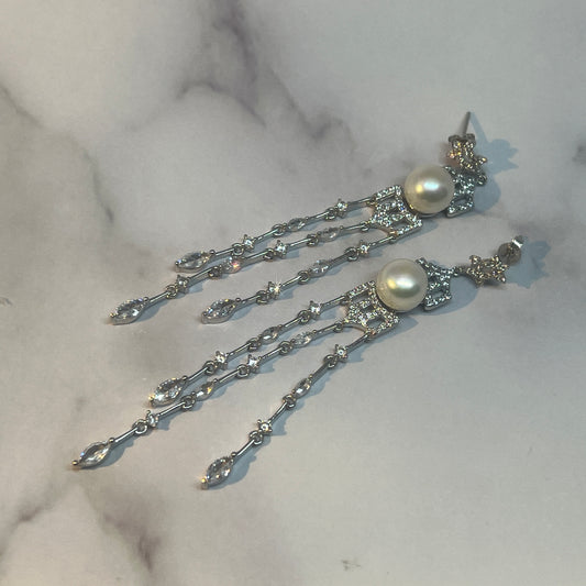 Glimmering Hexagram Long Dangling Freshwater Pearl Earrings